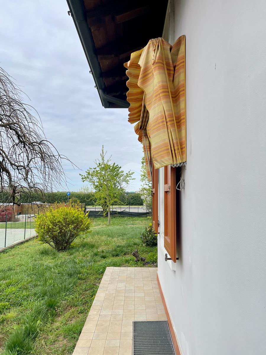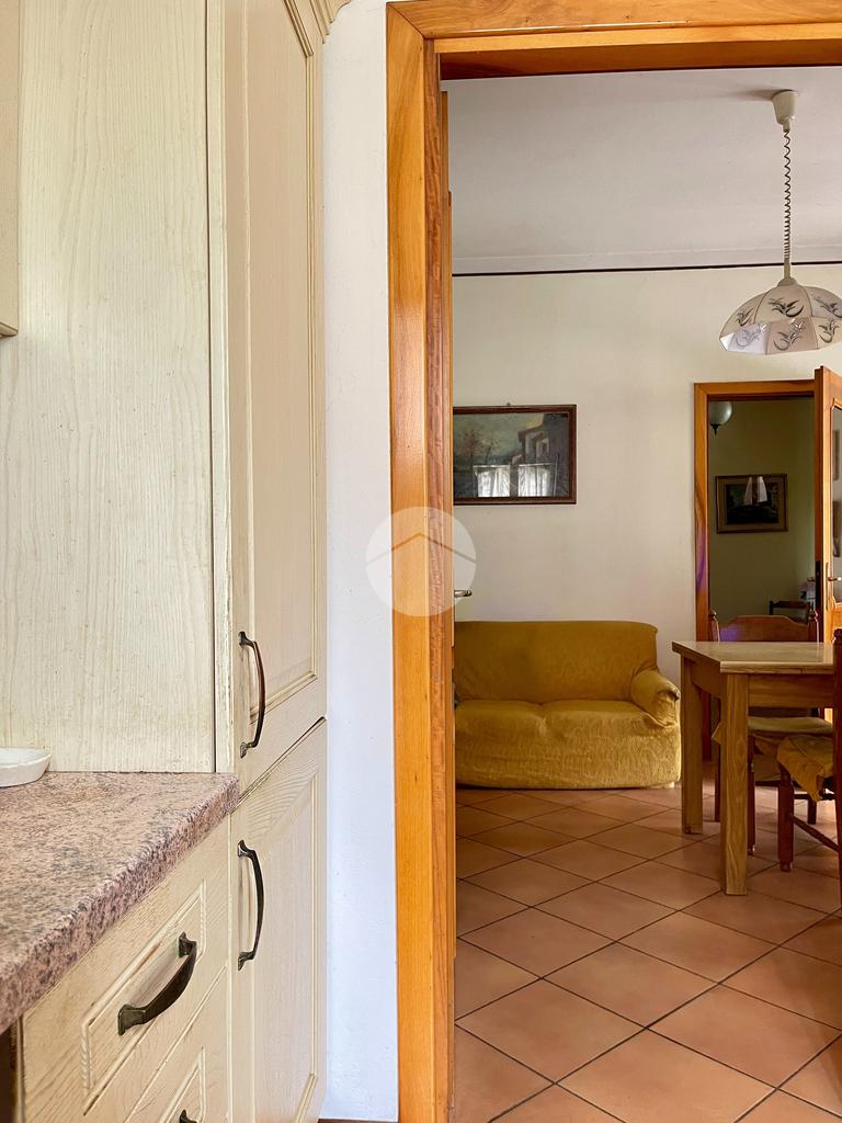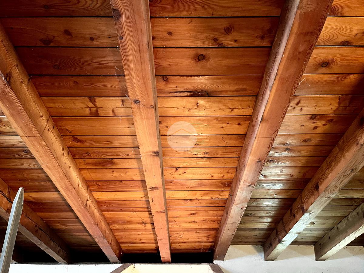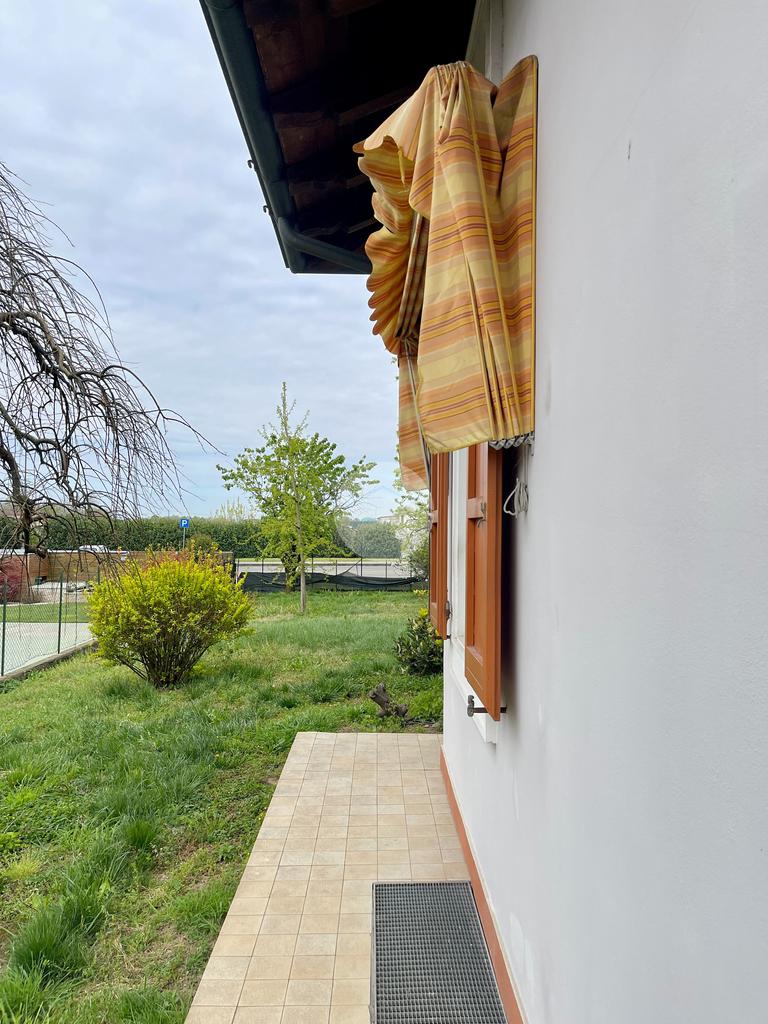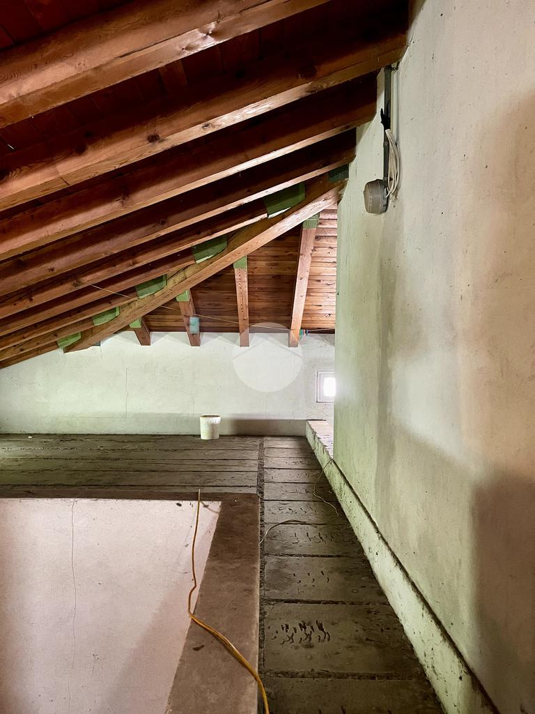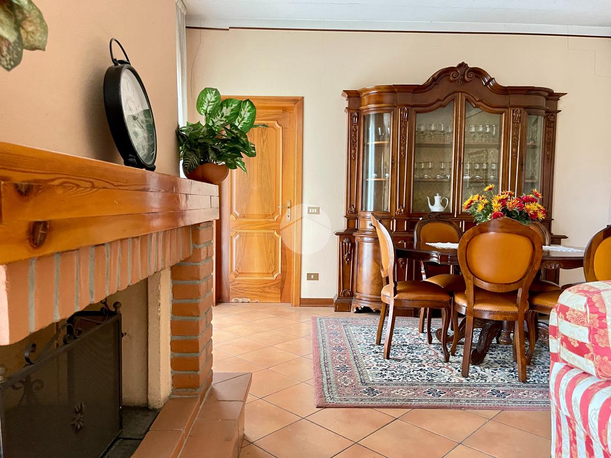 Nella zona giorno troviamo la cucina separata con porta finestra e finestra, la sala da pranzo con porta finestra e il soggiorno con camino a legna e due porte finestre che conducono al portico e al giardino sul retro.