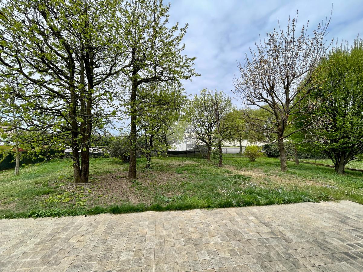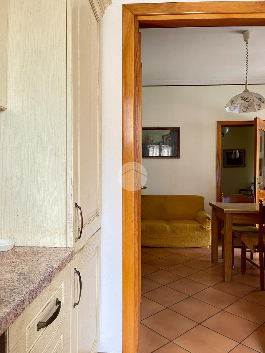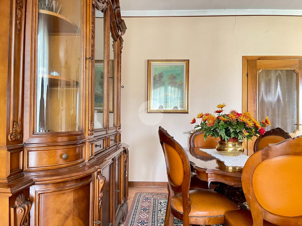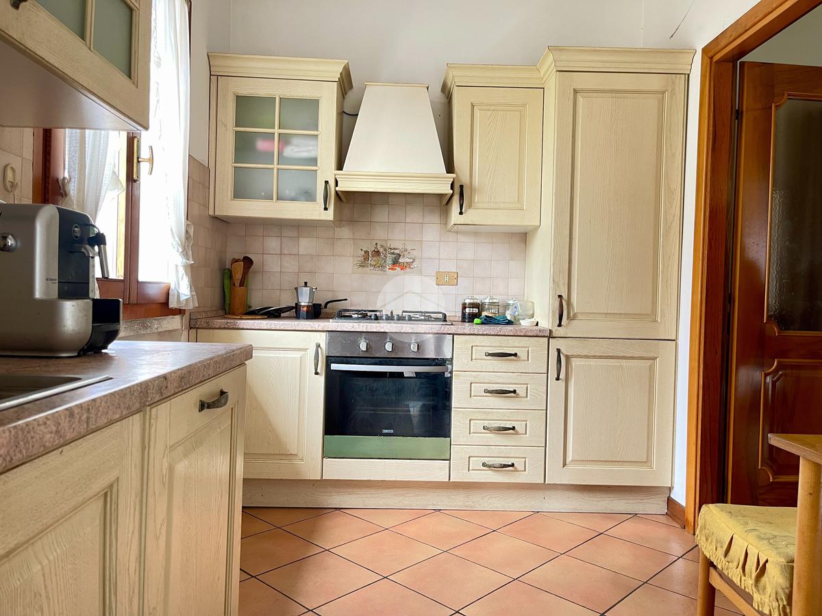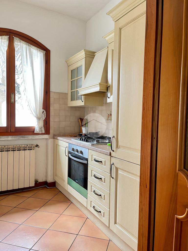 Nella zona giorno troviamo la cucina separata con porta finestra e finestra, la sala da pranzo con porta finestra e il soggiorno con camino a legna e due porte finestre che conducono al portico e al giardino sul retro.